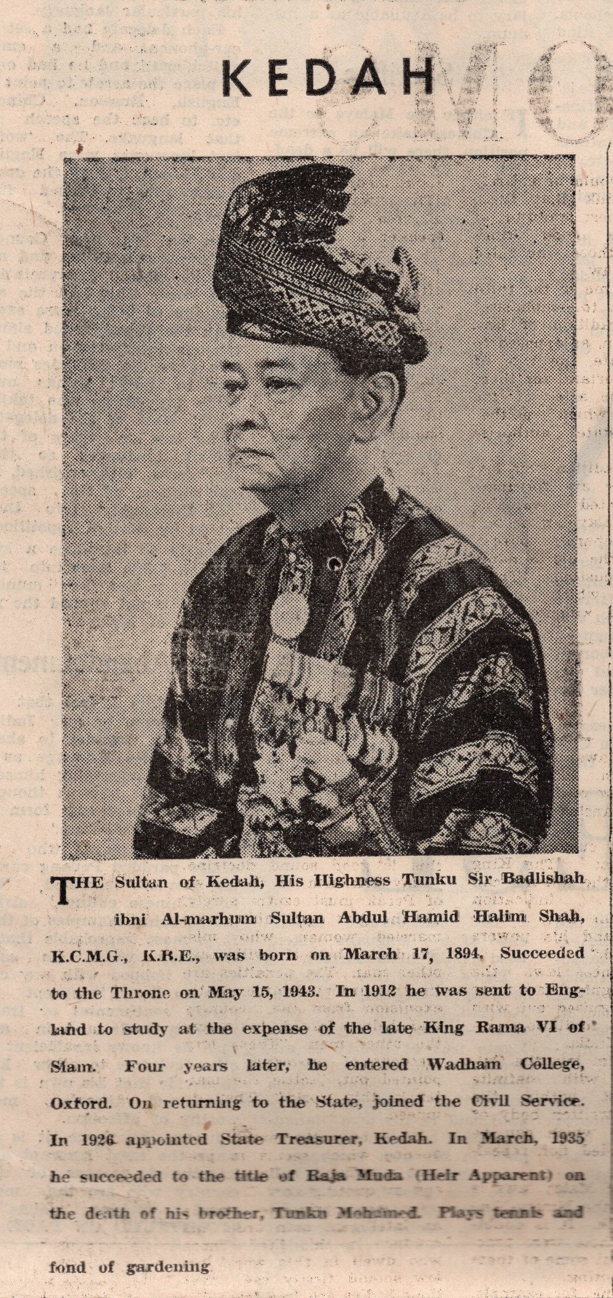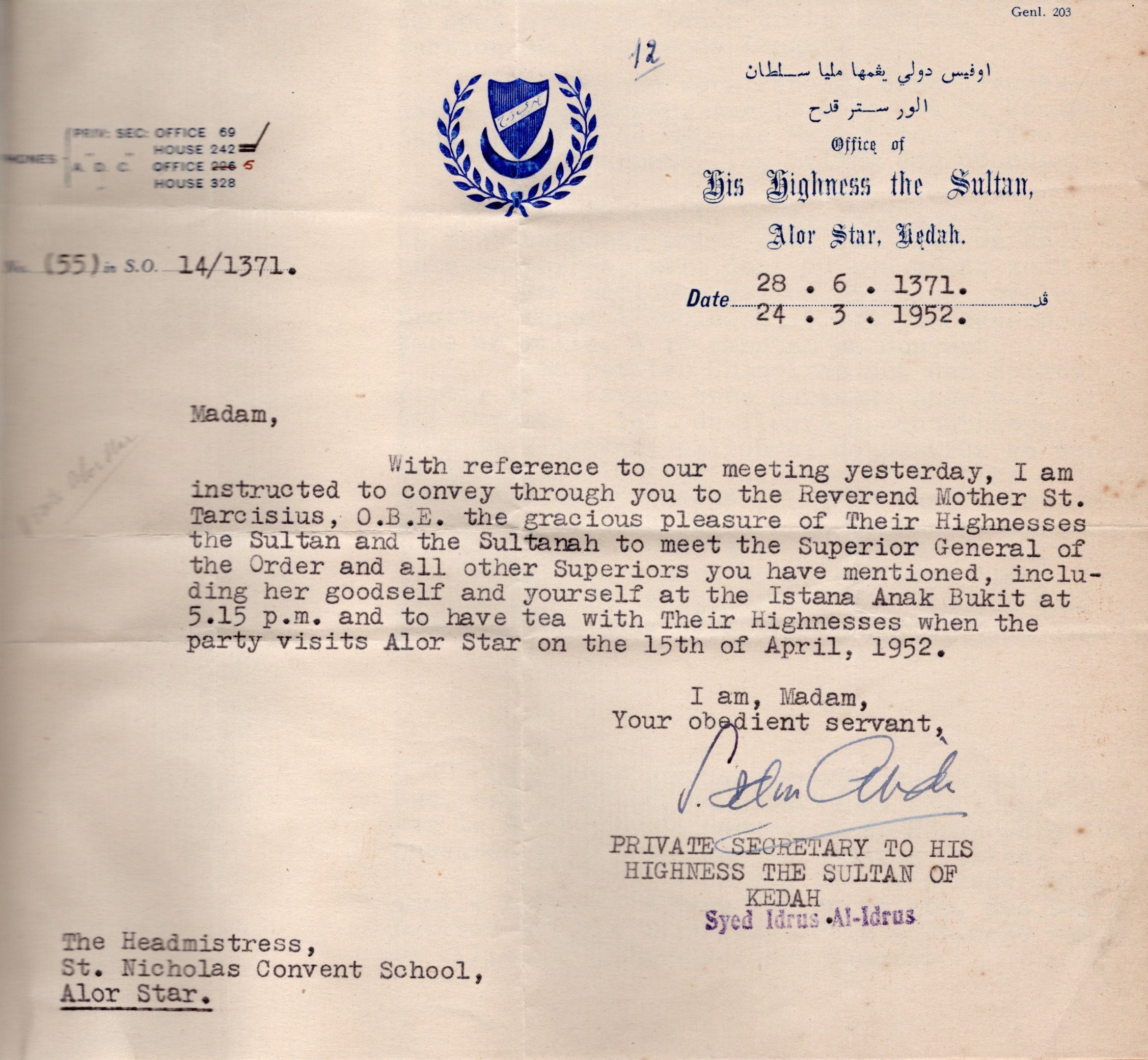 Mère Jean reçoit en amont de sa visite à Alor Star, par l’intermédiaire de Mère Tarcisius, une invitation à prendre le thé chez le sultan. Le maintien des relations entre le sultanat et les soeurs est significatif et marque une volonté mutuelle de poursuivre selon l’ancien ordre. Le sultan, qui a étudié en Europe, connaissait quelques rudiments de français et se montrait manifestement favorable envers les Britanniques.