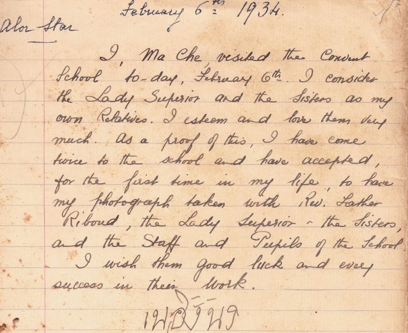 Mot écrit par la sultane Ma Che après sa visite dans l'école des soeurs (1934, archives des sœurs de l'EJNB en Malaisie, annales d'Alor Star) |