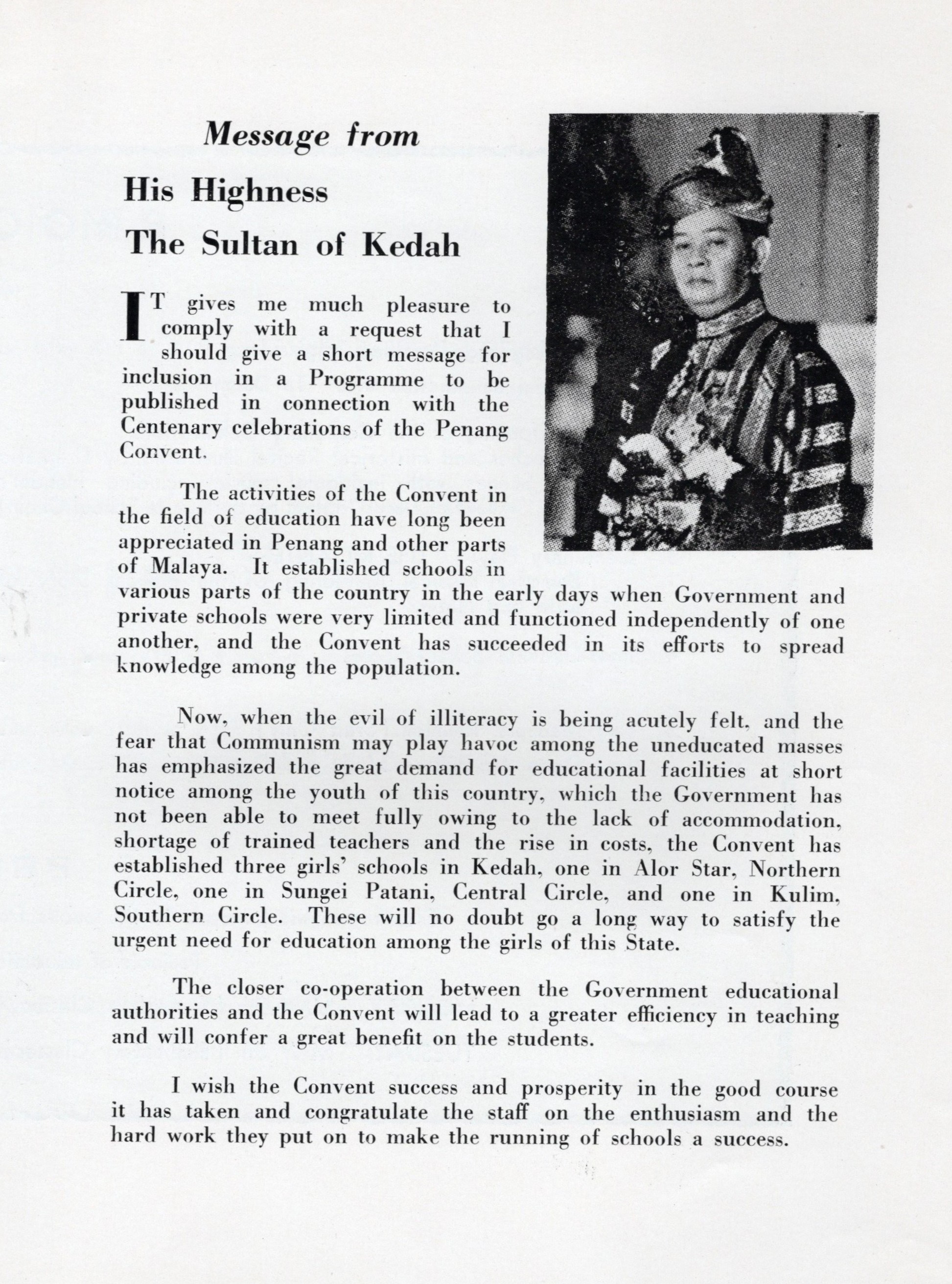 En 1950, le secrétaire d’État du Kedah aurait déclaré à la supérieure régionale de Malaisie que : « Nous voulons des écoles missionnaires dans le Kedah ».